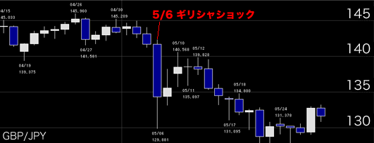 上のチャートは5/6のいわゆる『ギリシャショック』付近のポンド/円の日足チャートです。